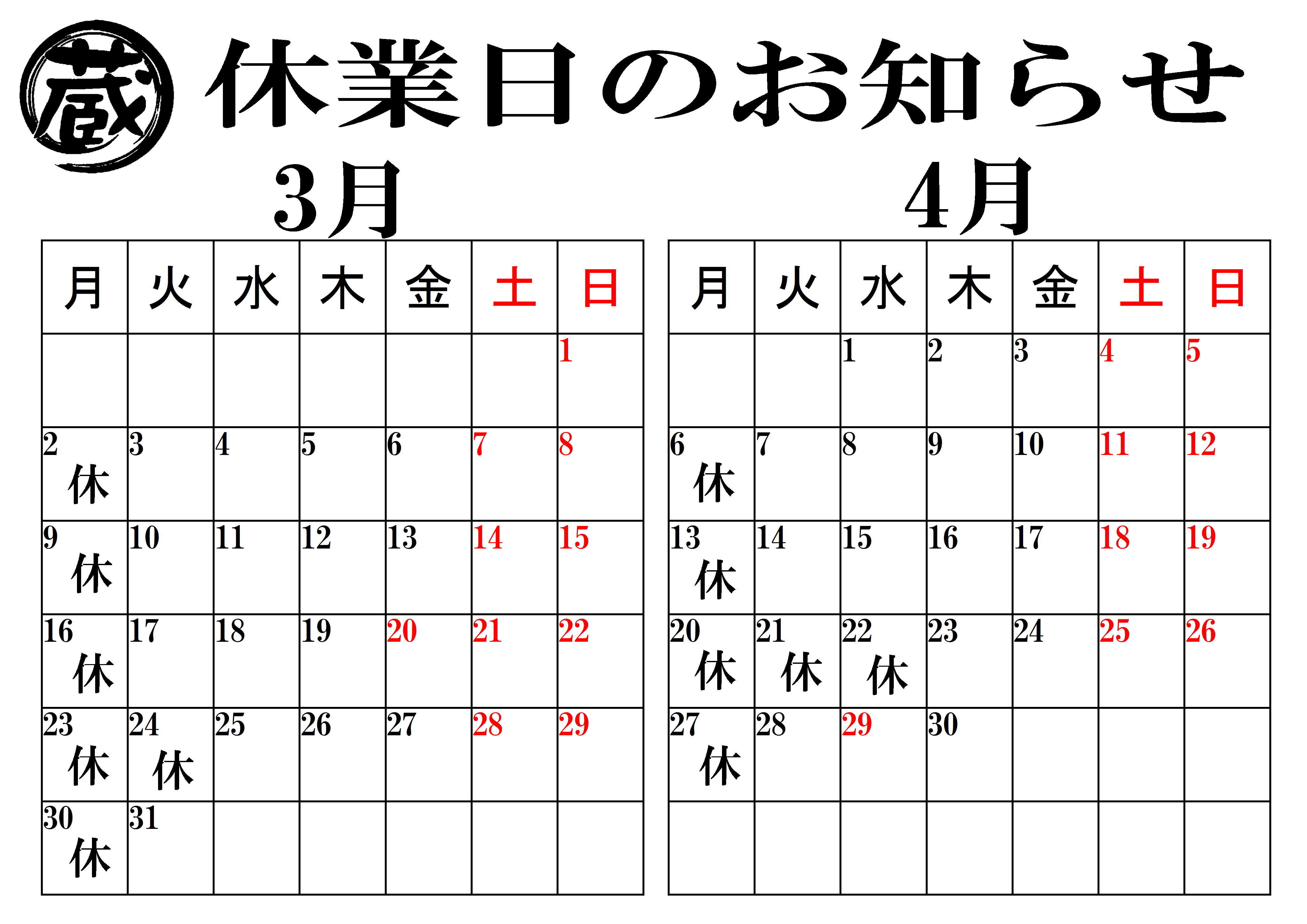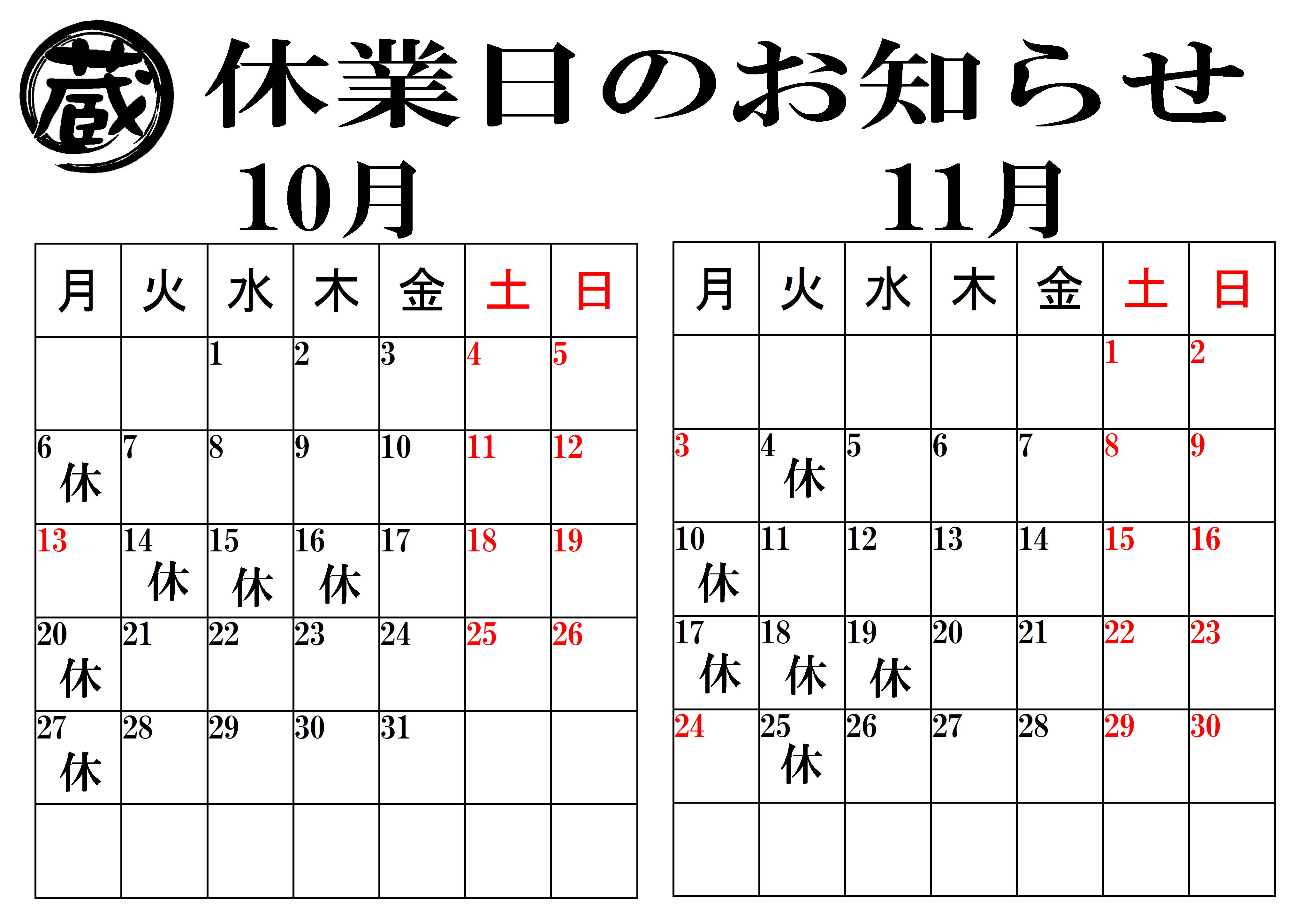 定休日のお知らせ